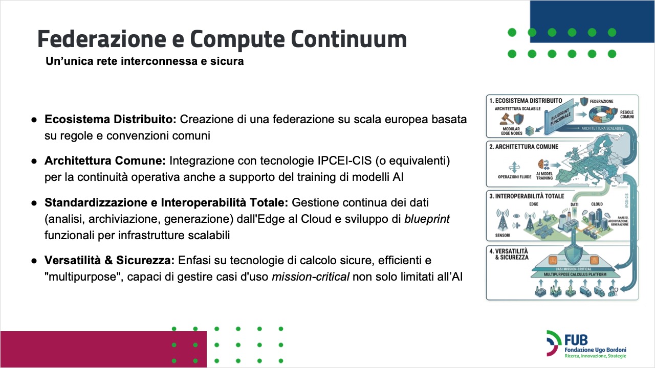 L’obiettivo è rafforzare la competitività europea nell’economia digitale globale attraverso lo sviluppo di una filiera completa, dalla realizzazione di data center alla fornitura di servizi cloud e intelligenza artificiale, fino alla capacità di elaborare e utilizzare i dati in prossimità del loro luogo di generazione. L’iniziativa promuove inoltre la creazione di un sistema connesso su scala europea, basato su infrastrutture interoperabili e accessibili secondo principi aperti e non discriminatori, in grado di operare come un continuum computazionale tra edge e cloud, supportare applicazioni avanzate anche in ambiti critici e favorire lo sviluppo di servizi innovativi.