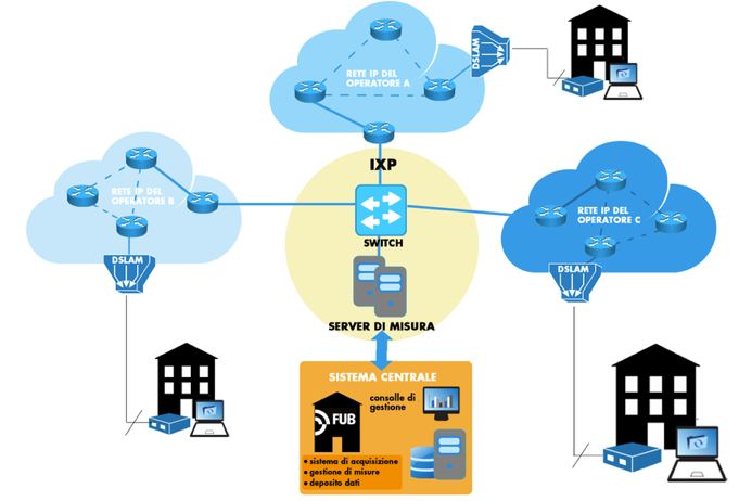 Come accennato prima, la seconda finalità del progetto Misura Internet è quella di raccogliere dati statistici per monitorare le prestazioni complessive del mercato. A tal fine, nel corso degli anni è stata allestita sul territorio nazionale, in collaborazione con la Direzione Generale Servizi Territoriali del MIMIT, una rete di monitoraggio della qualità del servizio di accesso ad Internet ospitata all’interno delle case del Made in Italy. In ciascuna casa è stato allestito un data center, all’interno del quale ciascun operatore di rete, Nazionale o Regionale, è tenuto a portare le due connessioni internet maggiormente vendute. Inoltre, al fine di rendere le postazioni di misura il quanto più simili all’esperienza media dell’utente, sono stati presi degli accorgimenti sulla distanza tra la centrale e il punto di misura, nonché sull’attenuazione fisica della linea, come mostrato in figura.